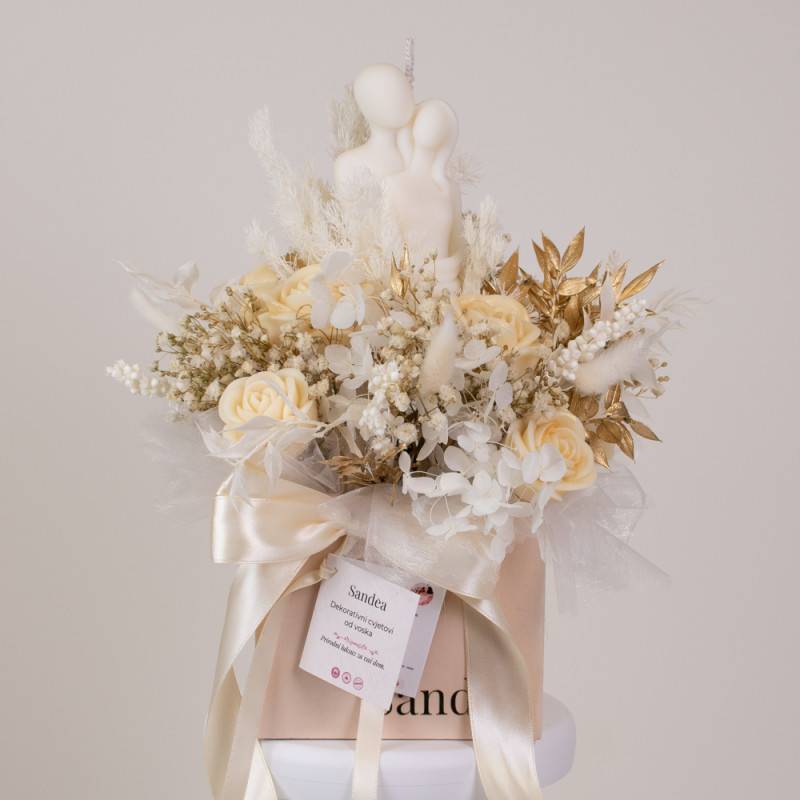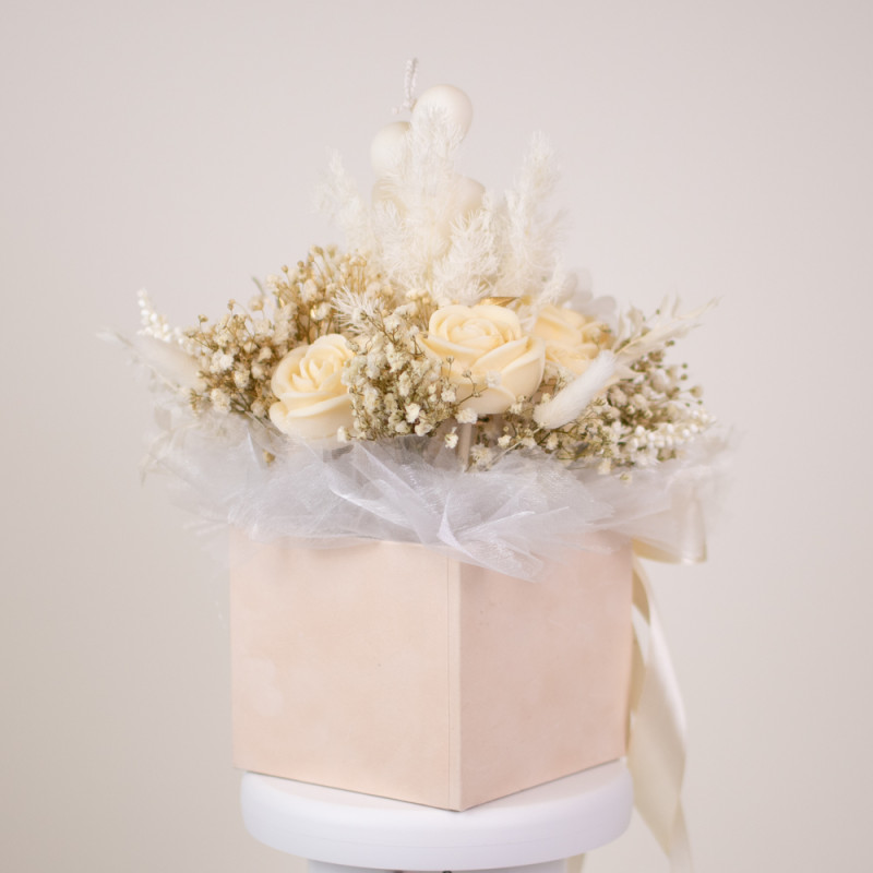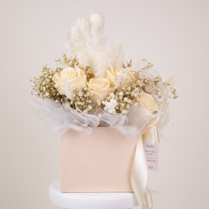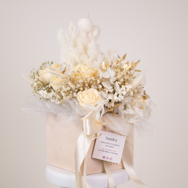 Svaki dekorativni aranžman od voska izrađen je ručno, koristeći samo 100% prirodne materijale. Cvjetovi od biljnog voska odišu profinjenim mirisom božura, koji simbolizira ljubav, eleganciju i novi početak. Aranžman dolazi u ručno rađenoj kutiji s satenskom mašnom, što mu daje luksuzan, ali topao izgled.