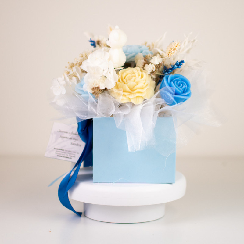 Ručni plavi aranžman od biljnog voska SANDEA s medvjedićem izrađen je u potpunosti od prirodnih materijala. Cvjetovi od biljnog voska s mirisom božura kombinirani su sa stabiliziranim cvijećem i dekorativnim elementima bez plastike. Savršen je poklon za rođenje dječaka ili kao dekoracija dječje sobe.
