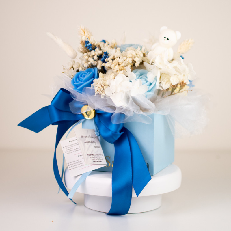 Posebnu toplinu daje plišani medvjedić, simbol nježnosti i djetinjstva, koji čini aranžman savršenim darom za rođenje dječaka ili poklon mladoj mami.