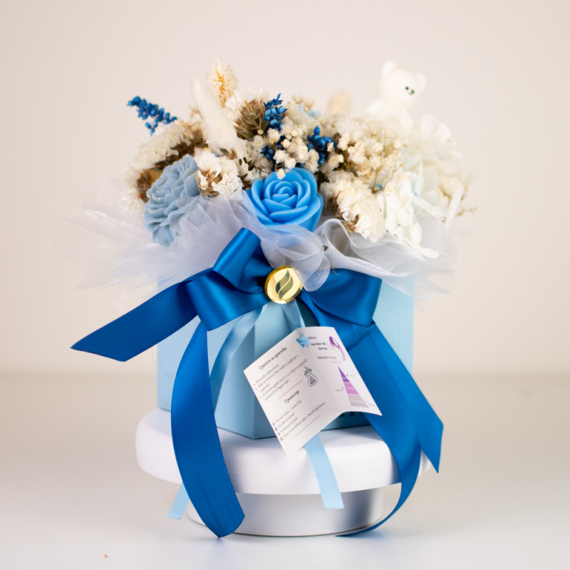 Sve je složeno u ručnu kutiju plave boje, ukrašenu satenskom mašnom i prirodnim detaljima.