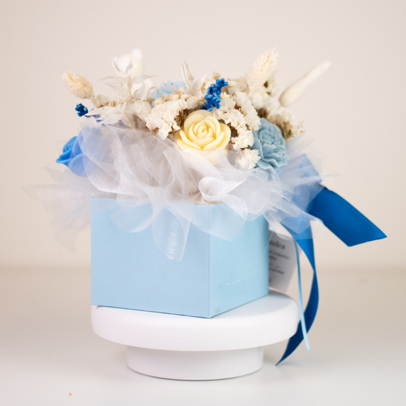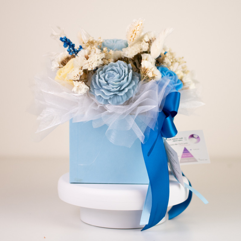 Ovaj plavi mirisni aranžman izrađen je ručno od 100% prirodnih materijala, a središnji dio čine cvjetovi od biljnog voska s mirisom božura, čiji nježni tonovi unose osjećaj smirenosti i ljubavi.
