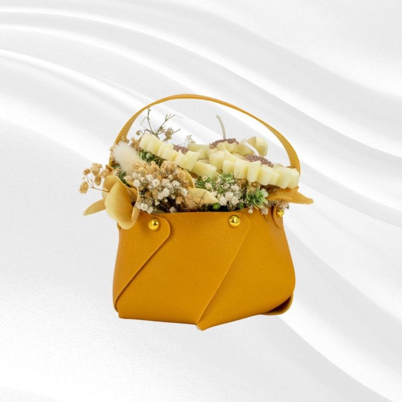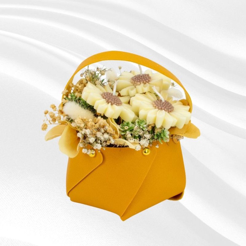 Ručno izrađen u elegantnoj torbici od eko kože, ovaj buket krije unutar sebe čarobni svijet nježne margarete i toplog svjetla svijeće od 100% prirodnog biljnog (kokos ili uljena repica) voska.