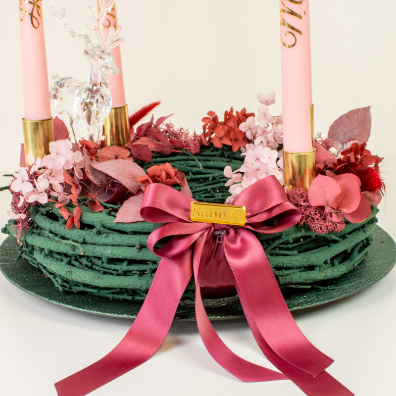 Središnji detalj je bordo satenska mašna s elegantnom metalnom pločicom SANDEA, koja dodaje notu luksuza i ručne izrade. Ružičaste svijeće u zlatnim držačima unose toplinu i mekoću, stvarajući nježan kontrast s bogatom zelenom podlogom od šiba.