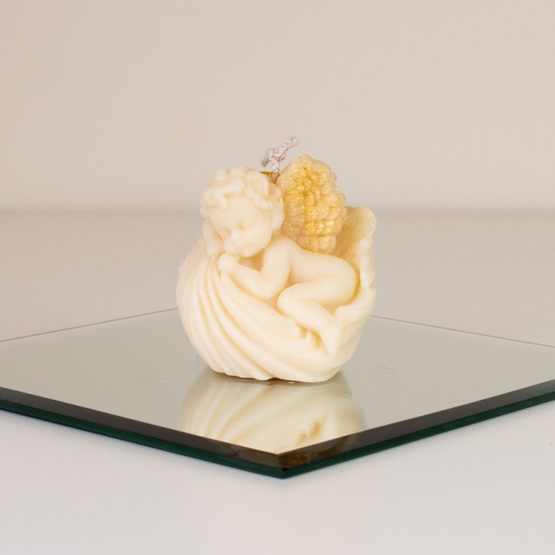 Motiv spavajućeg anđela u nježnim krilima predstavlja čistoću i spokoj, dok su zlatni detalji ručno naneseni kako bi svijeći dali elegantan blagdanski sjaj.