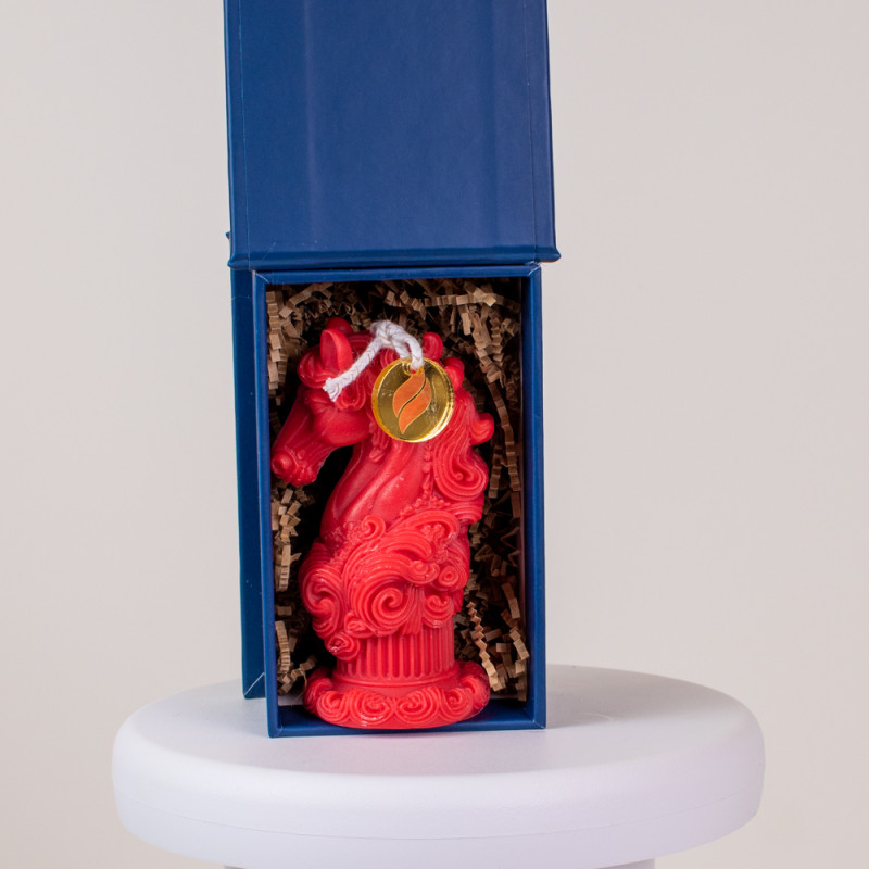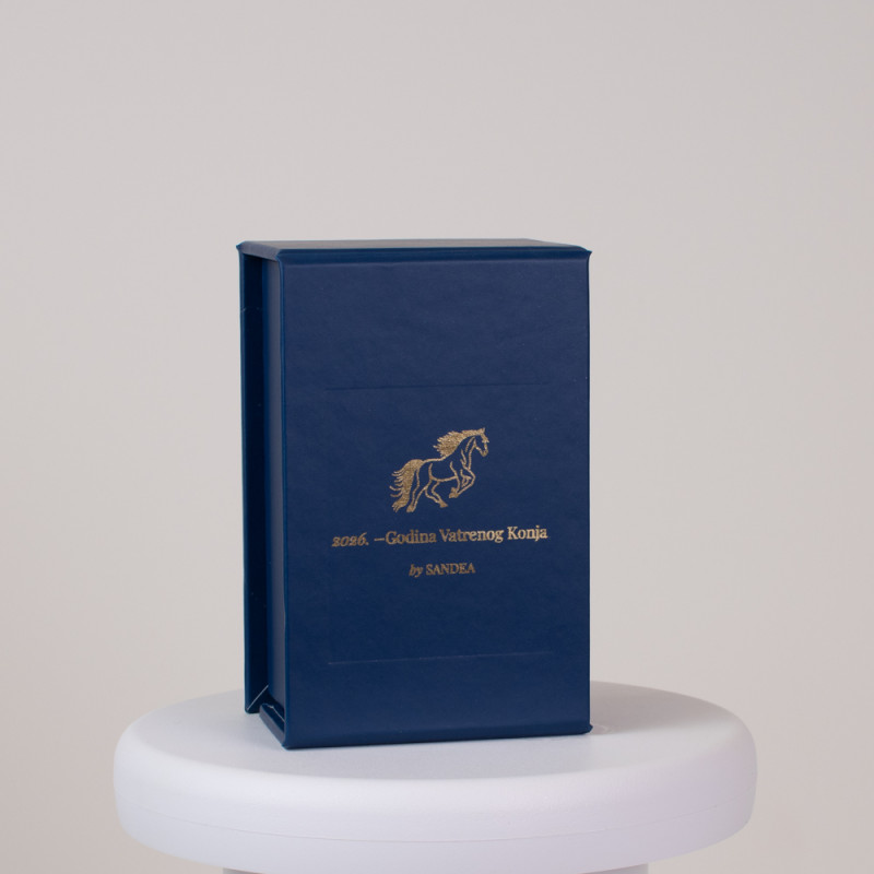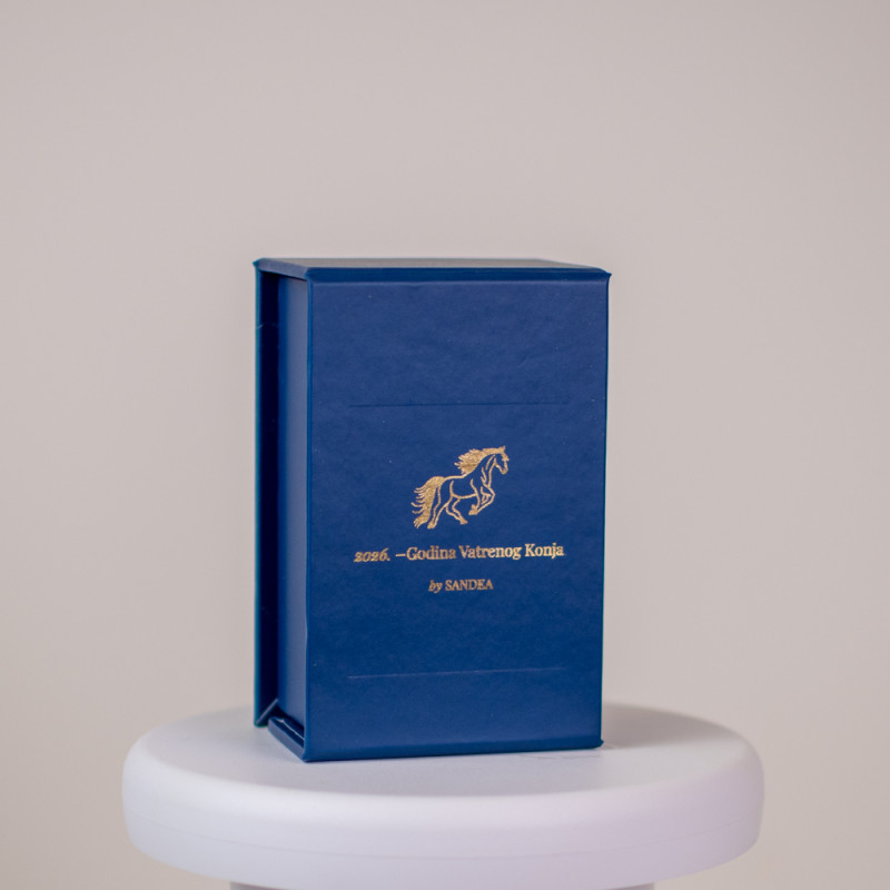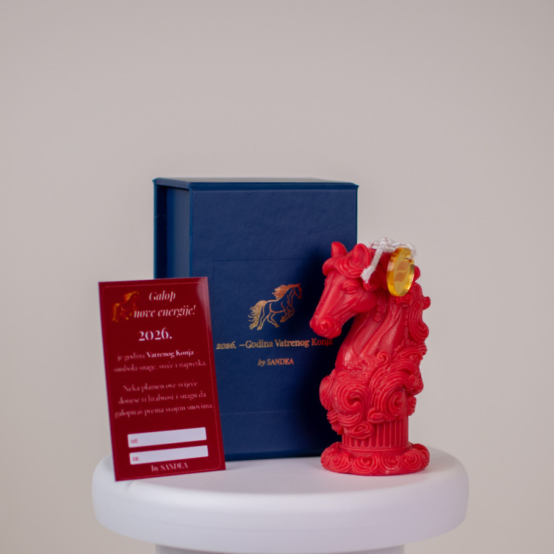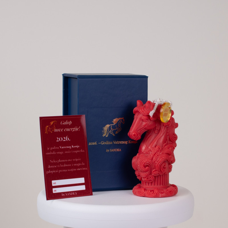 Ekskluzivna svijeća 2026. – Godina Vatrenog Konja simbol je snage, slobode i napretka. Ručno izrađena od 100% prirodnog biljnog voska, dolazi u luksuznoj tamno plavoj kutiji sa zlatnim tiskom i prigodnom karticom “Galop nove energije”. Crvena boja svijeće predstavlja strast i hrabrost, dok motiv konja donosi simboliku pokreta, uspjeha i novih početaka. Savršen poklon za sve koji žele s optimizmom zakoračiti u novu godinu.