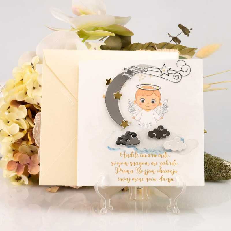 Dizajn čestitke uključuje prekrasnog anđela dječaka, polumjesec, oblake i zvjezdice, stvarajući atmosferu čarobne i duhovne proslave.