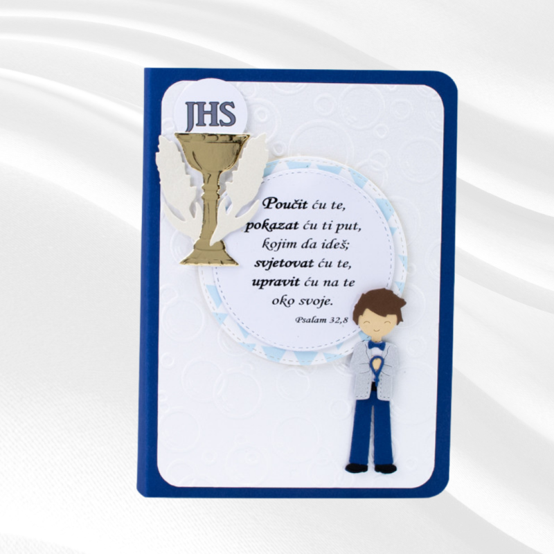 Elegantna čestitka za Prvu pričest ili Svetu potvrdu, obogaćena zlatnim listićima za dodir luksuza. Personalizirajte je imenom i dodatnim tekstom. Savršena uspomena na važne sakramente.