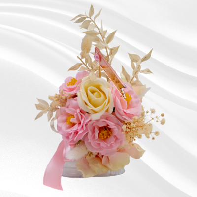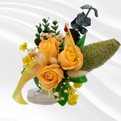 Proljetna Rapsodija je ručno izrađeni cvjetni aranžman od sapuna koji kombinira sapunske cvjetove s dodatkom suhog i umjetnog cvijeća, smješten u elegantnu bijelu kutiju.