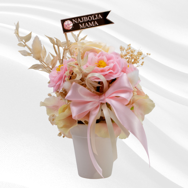 Ovaj čarobni buket dolazi u prekrasnoj keramičkoj tegli koja se može koristiti iznova, čineći ga ekološki osviještenim izborom. Osim toga, aranžman sadrži i suho cvijeće koje dodatno obogaćuje estetiku buketa.
