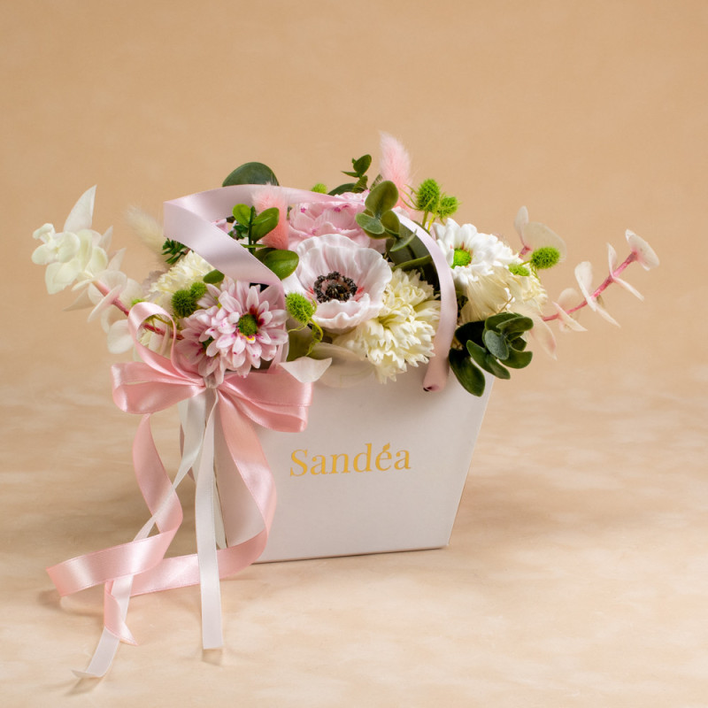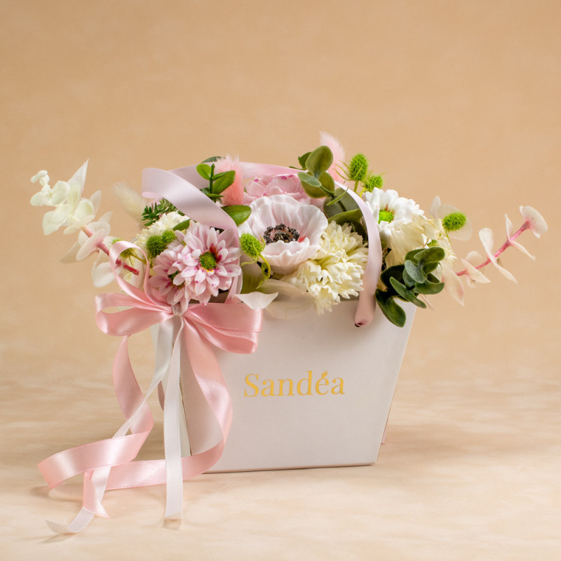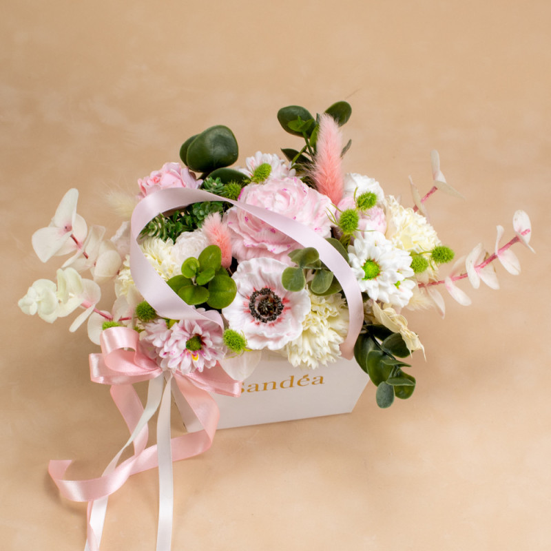 Proljetna Rapsodija je ručno izrađeni cvjetni aranžman od sapuna koji kombinira sapunske cvjetove s dodatkom suhog i umjetnog cvijeća, smješten u elegantnu bijelu kutiju.