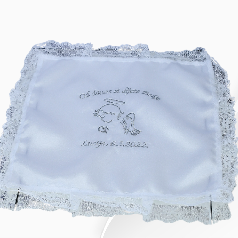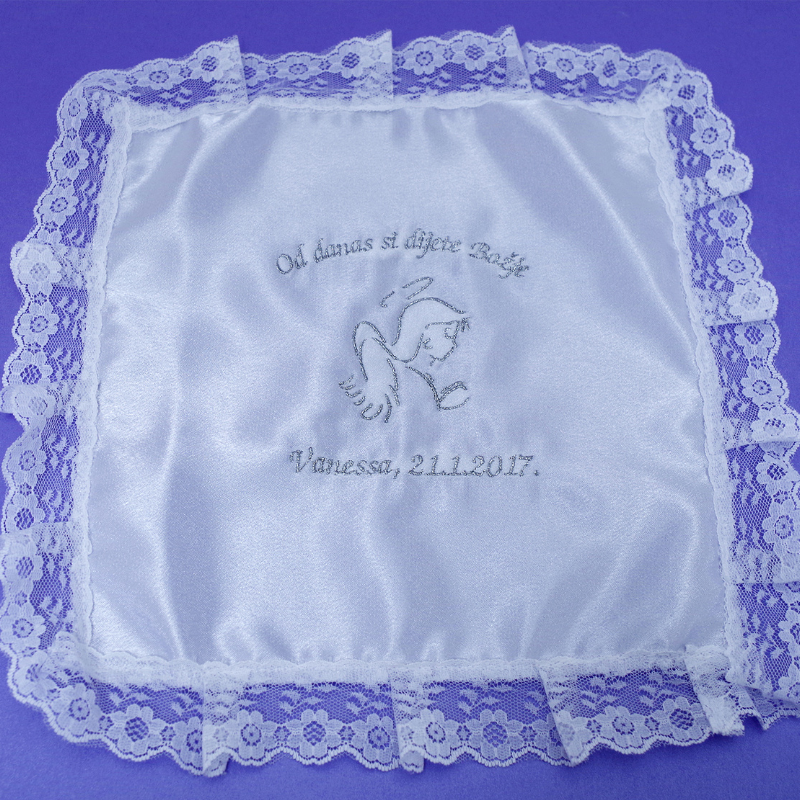 Motiv anđela: Motiv anđela, izvezen s velikom preciznošću, predstavlja zaštitu, čistoću i nevinost. Anđeo je simbol duhovne zaštite i božanske ljubavi, što ga čini savršenim izborom za krštenje. Izvezeni motiv dodaje estetsku vrijednost maramici, čineći je elegantnom i svečanom.