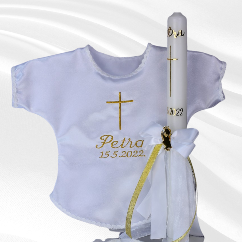Kutija sadrži košuljicu, svijeću, Bibliju te opcionalno krunicu i maramicu. Ime djeteta može biti izrađeno od akrila.