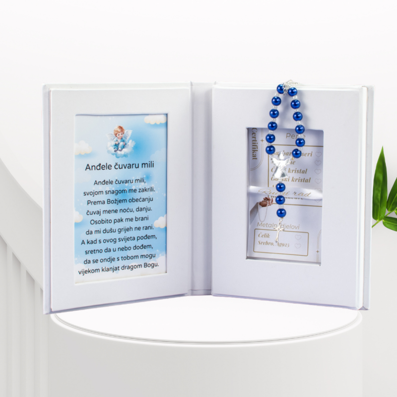 Personalizacija: Jedna od posebnosti ove krunice je mogućnost personalizacije. Na spojnici, koja može biti u obliku anđela, srca ili pločice, gravira se ime po vašem izboru. Ova personalizacija dodaje poseban dodir i emocionalnu vrijednost krunici, čineći je savršenim darom za posebne prigode kao što su krštenja, prve pričesti ili rođendani.