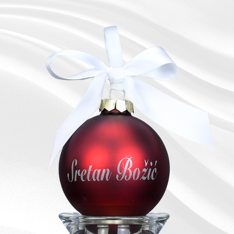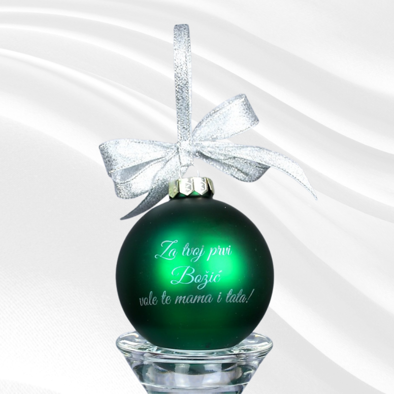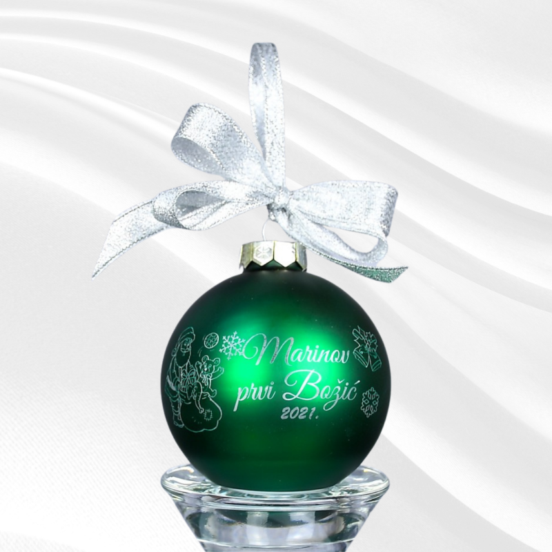 Staklena kuglica za bor promjera 8 cm s graviranim imenom, godinom i posvetom. Savršen poklon za stvaranje uspomena i dodavanje osobnog dodira vašem božićnom drvcu.