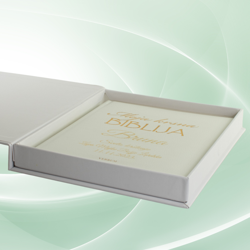 Njene dimenzije (27x23x4 cm) idealne su za pakiranje manjih proizvoda poput „Moje krsne Biblije“ ili drugih kreativnih artikala. Svojim elegantnim završnim dodirom,