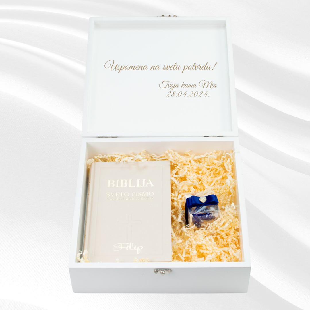 Biblija je klasičan poklon za prvu pričest, ali dodavanjem personalizacije poput imena i datuma prve pričesti postaje unikatna i posebna za prvopričesnika/cu.