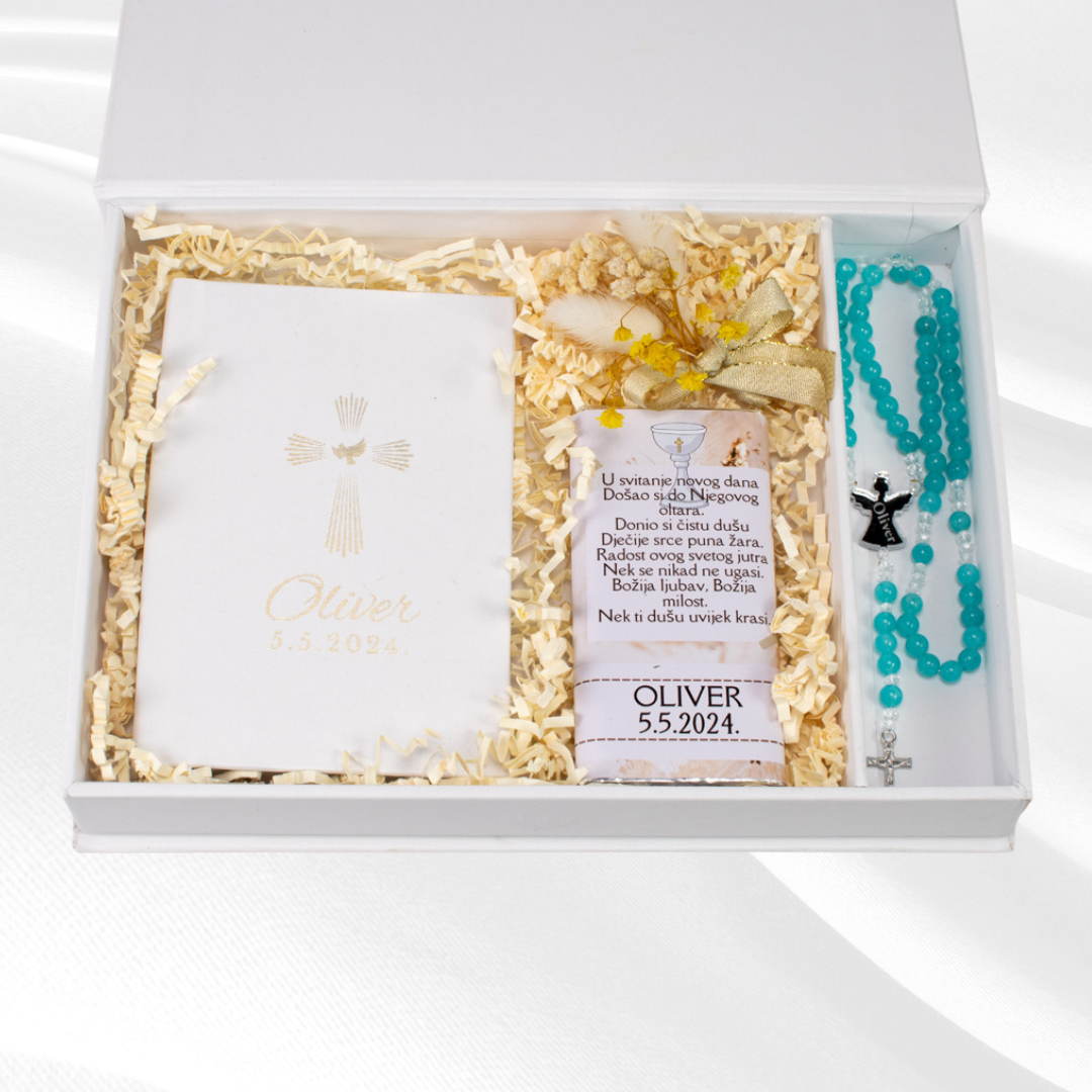 Za sve one koji žele pokloniti lijepo aranžirane poklone u našoj ponudi možete pronaći posebno složeni pakete. U njima smo spojili različite duhovne poklone poput krunice, molitvenika, biblije, svijeća i drugih simbola vjere. To je sveobuhvatan dar koji će djetetu pružiti bogato iskustvo prve pričesti.