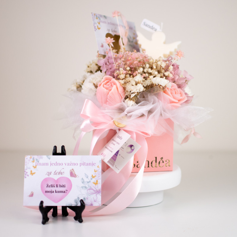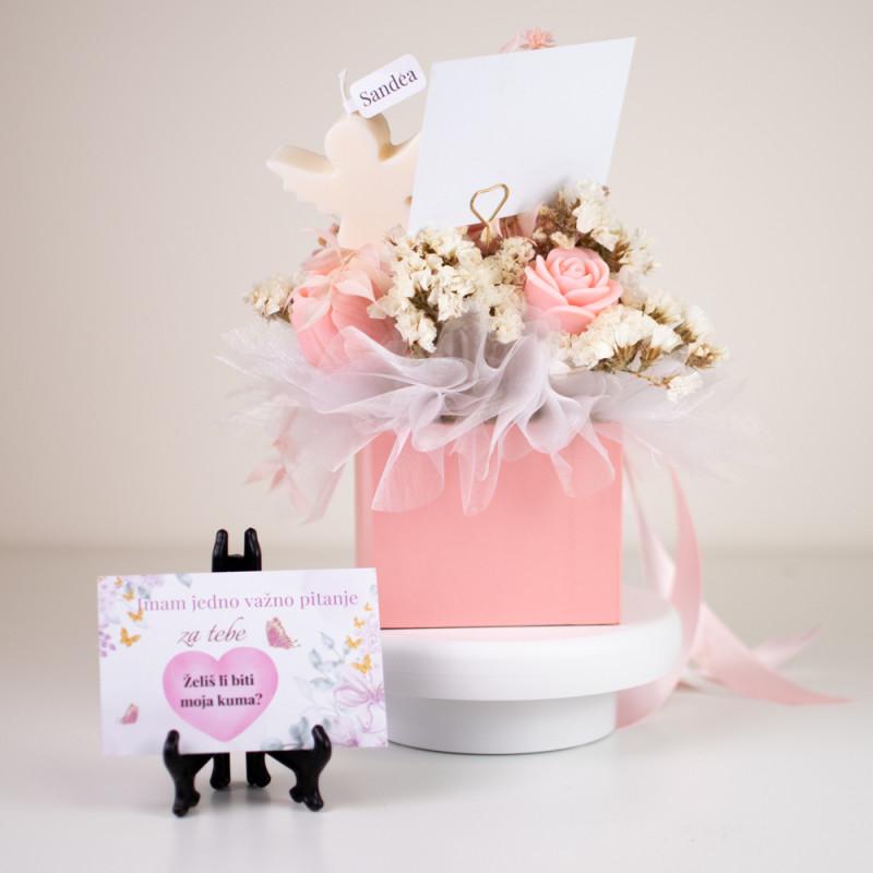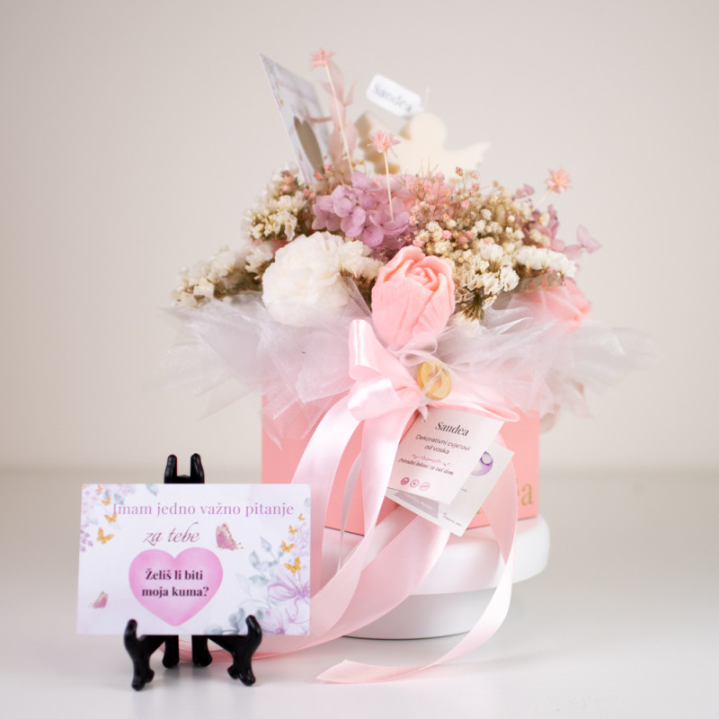 Božur, kao simbol ljubavi, ženstvenosti i blagostanja, čini ovaj aranžman posebnim poklonom za krštenje, rođenje djevojčice ili pitanje za kumu.