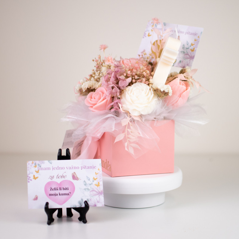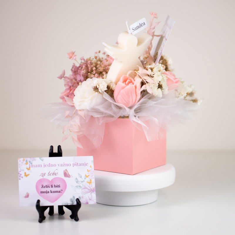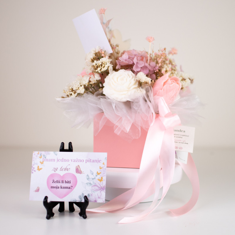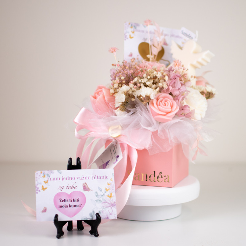 Ružičasti aranžman od biljnog voska SANDEA s mirisom božura izrađen je u potpunosti od prirodnih materijala – bez plastike. Cvjetovi od biljnog voska, kombinirani sa stabiliziranim cvijećem i satenskom mašnom u ručno izrađenoj kutiji, čine ga idealnim poklonom za krštenje djevojčice, pitanje za kumu ili dar uz rođenje.