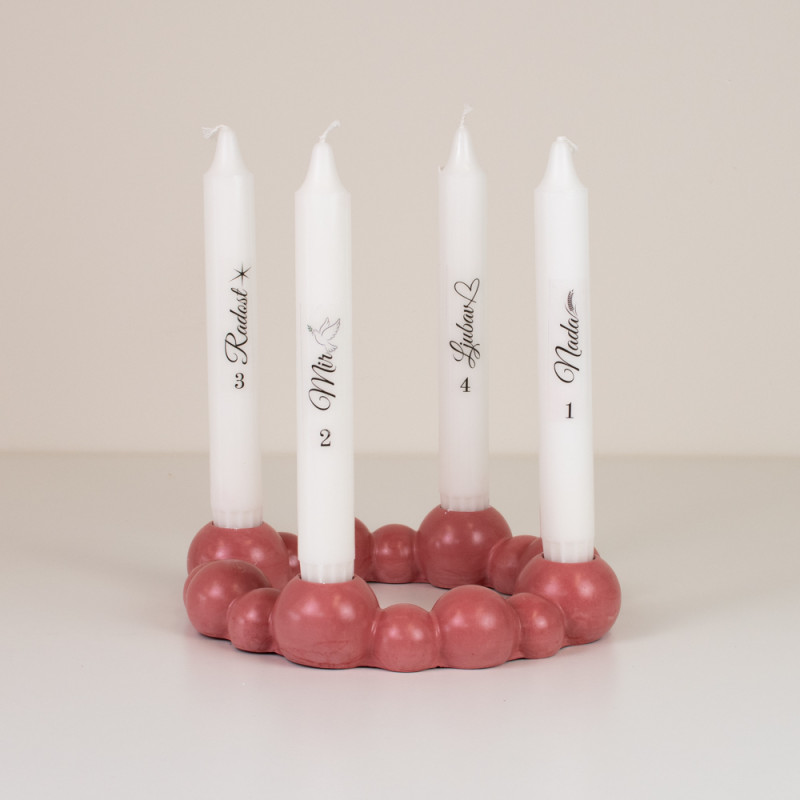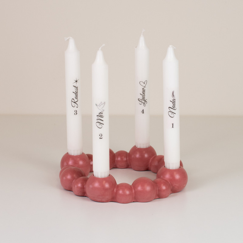 Svaka svijeća nosi prepoznatljiv simbol – broj 1 do 4, golubicu mira, zvijezdu radosti i srce ljubavi – koji dodatno naglašavaju značenje svake adventske nedjelje.