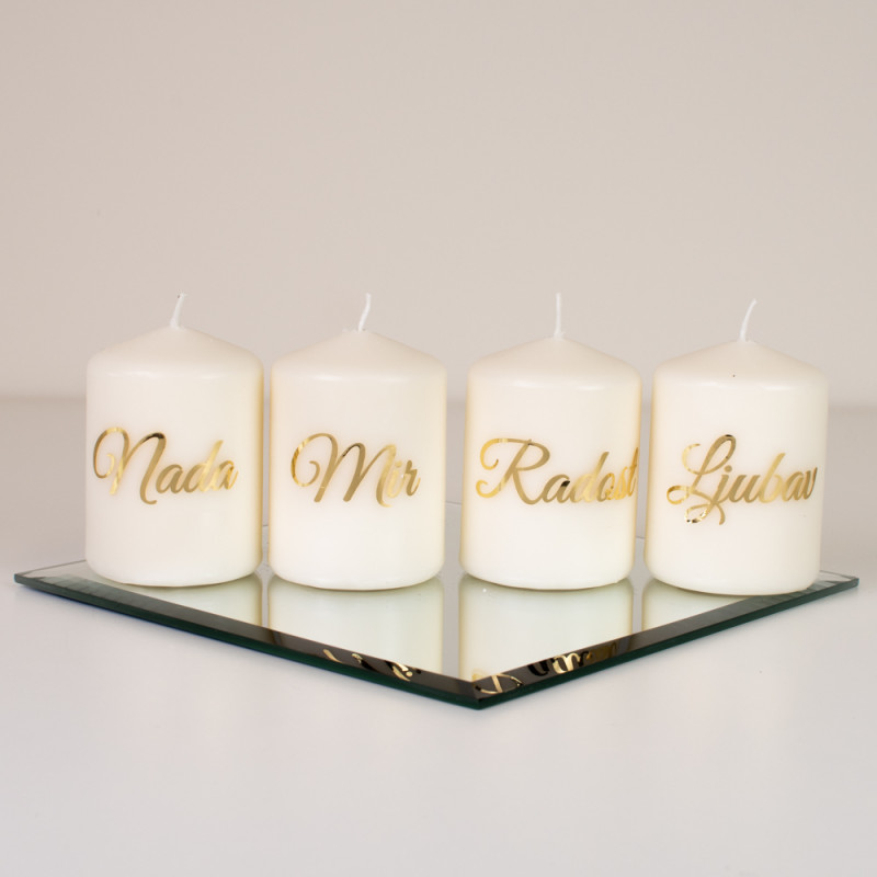 Svaka svijeća visine 8 cm i promjera 5 cm nosi zlatni natpis koji simbolizira četiri adventske vrijednosti: Nada, Mir, Radost i Ljubav.