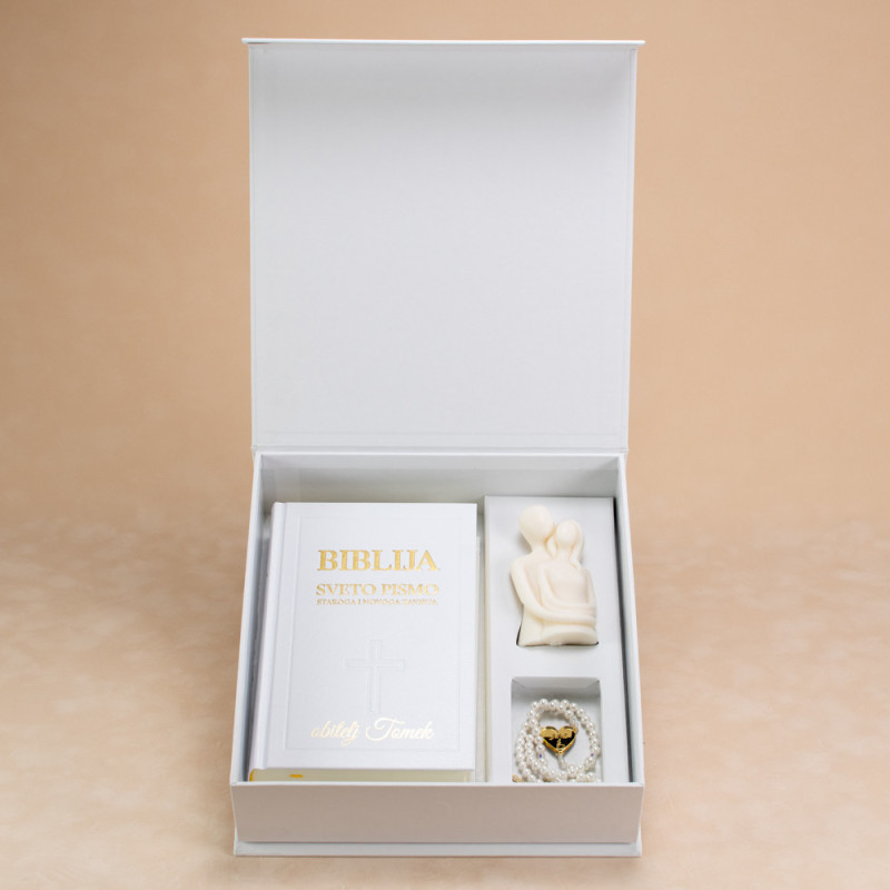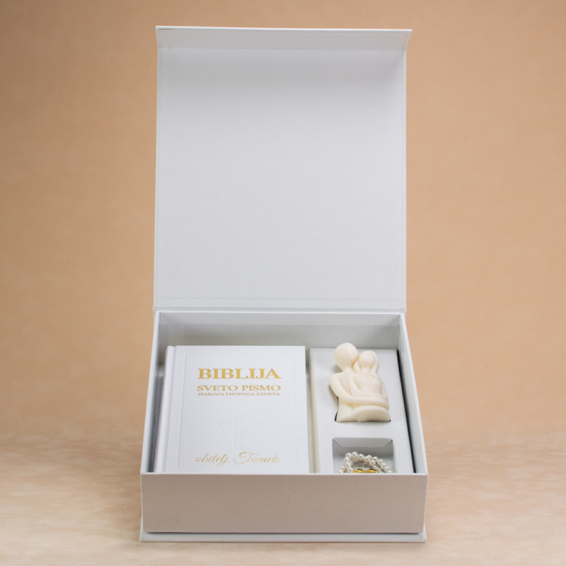 Po izboru – Sveta Biblija i krunica – ako se odlučite za dodatak ovih elemenata, dobit ćete personaliziranu cijenu poklona. Svaka krunica i Biblija odabrana je s pažnjom kako bi dodatno obogatila duhovnu vrijednost dara.
