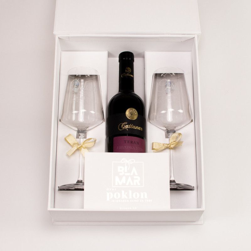 Naš Premium Vinski Box uključuje perla bijelu kutiju, dvije Leonardo čaše za vino i karticu za čestitku.