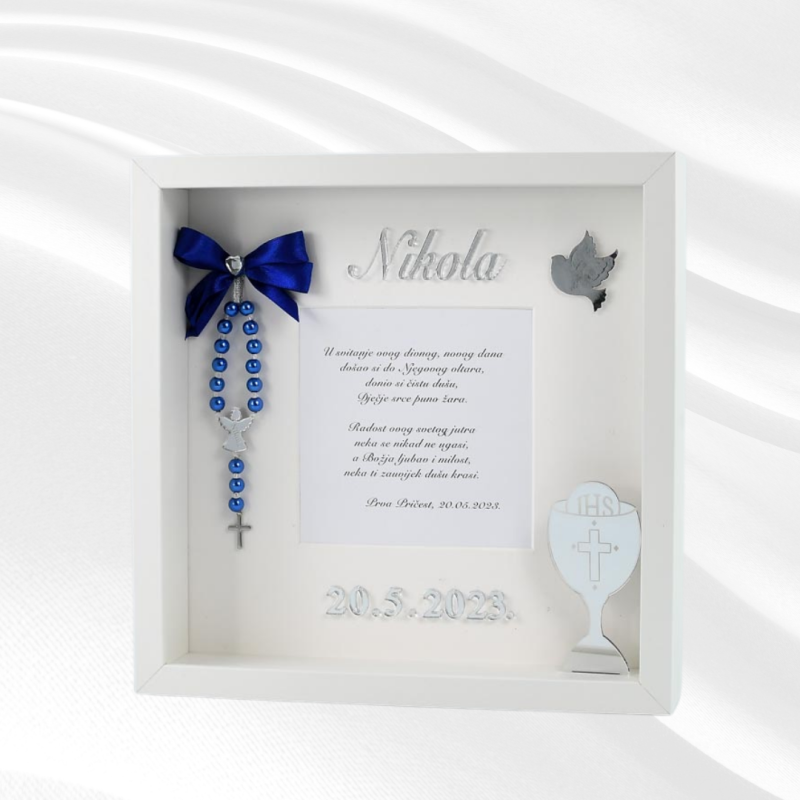 Ovaj elegantan okvir savršen je poklon za obitelj i prijatelje, pružajući im uspomenu koja će trajati zauvijek. Bilo da ga darujete za prvu pričest ili krizmu, ovaj personalizirani okvir s krunicom i kaležom bit će odličan poklon.