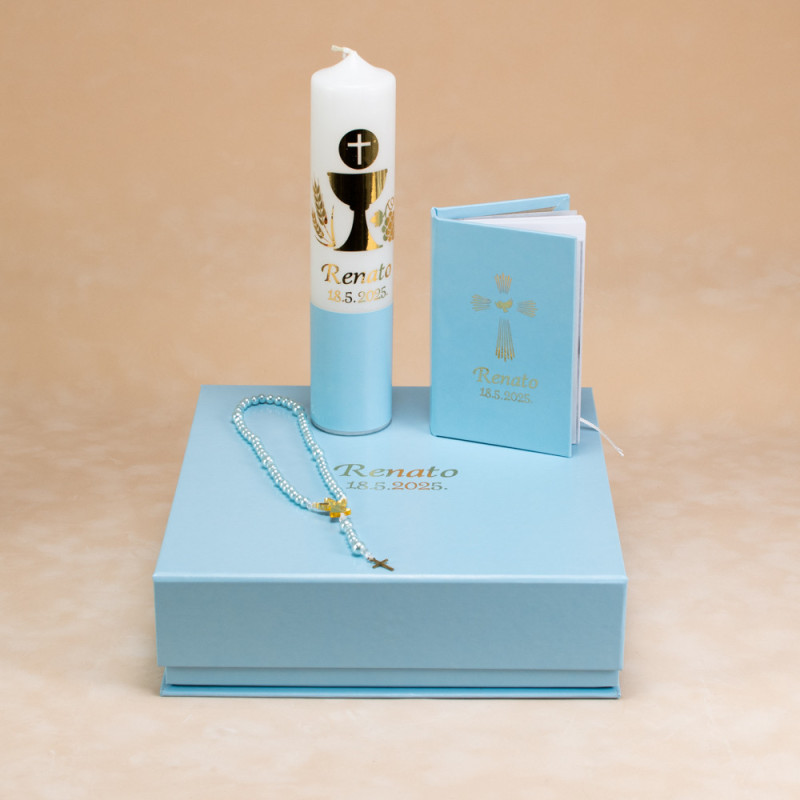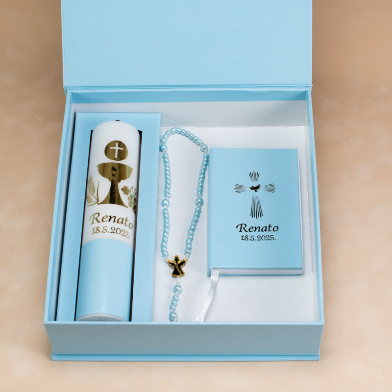 🔹 Svijeća za Prvu Pričest (50x240 mm) – tradicionalni simbol čistoće i svjetlosti vjere. Ova svijeća prati dijete u njegovom duhovnom putovanju i može se čuvati kao uspomena na ovaj poseban dan.