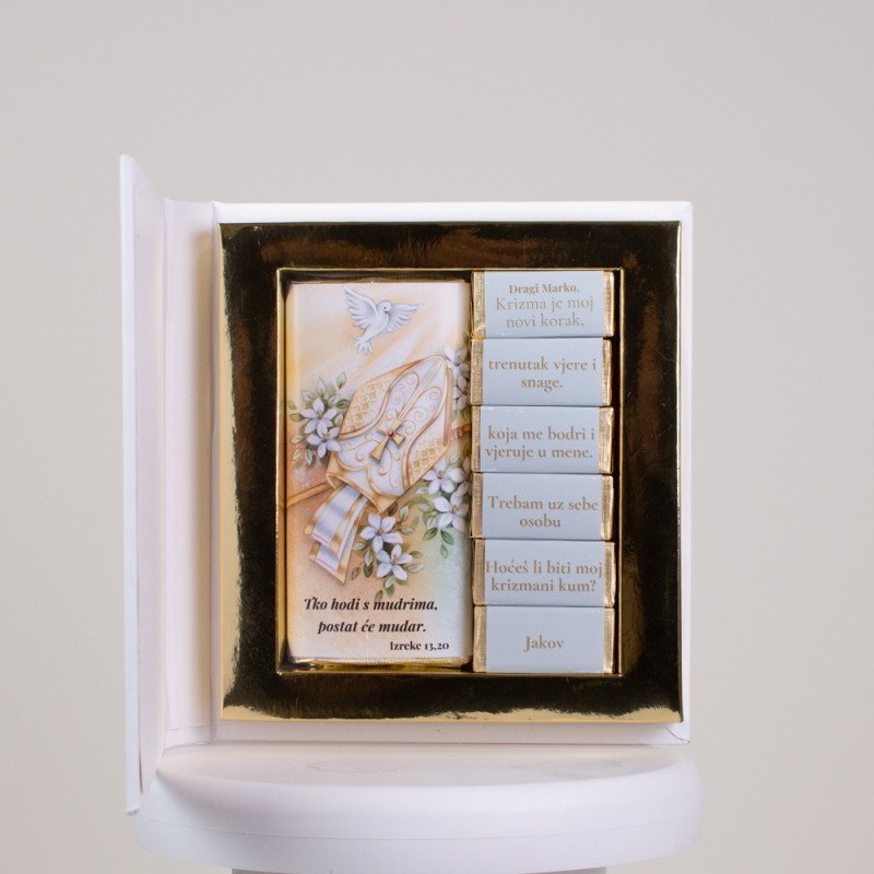 Set čokolada za poziv na kumstvo za Svetu Potvrdu. Sadrži 6 malih čokolada i 1 čokoladu od 40 g, sve pakirano u bijelu ručno izrađenu kutiju.