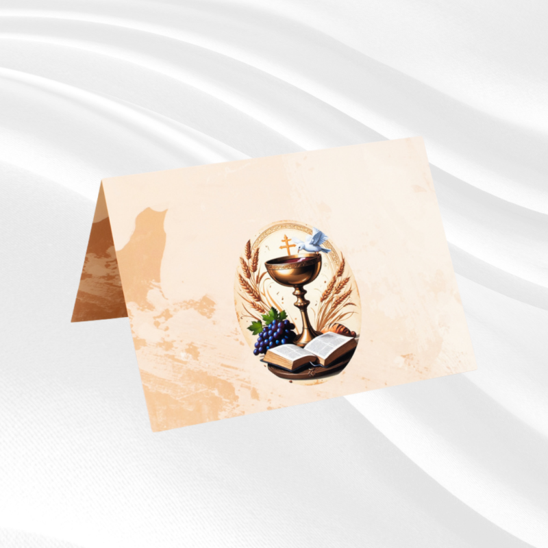 Posebno prilagođena za krizmanog kuma ili kumu, ova pozivnica odražava simboliku sakramenta krizme i zahvalnost za njihovu podršku u ovom važnom trenutku. Kalež i grožđe, koji se nalaze na dizajnu, dodatno naglašavaju duhovnu vrijednost ovog sakramenta.
