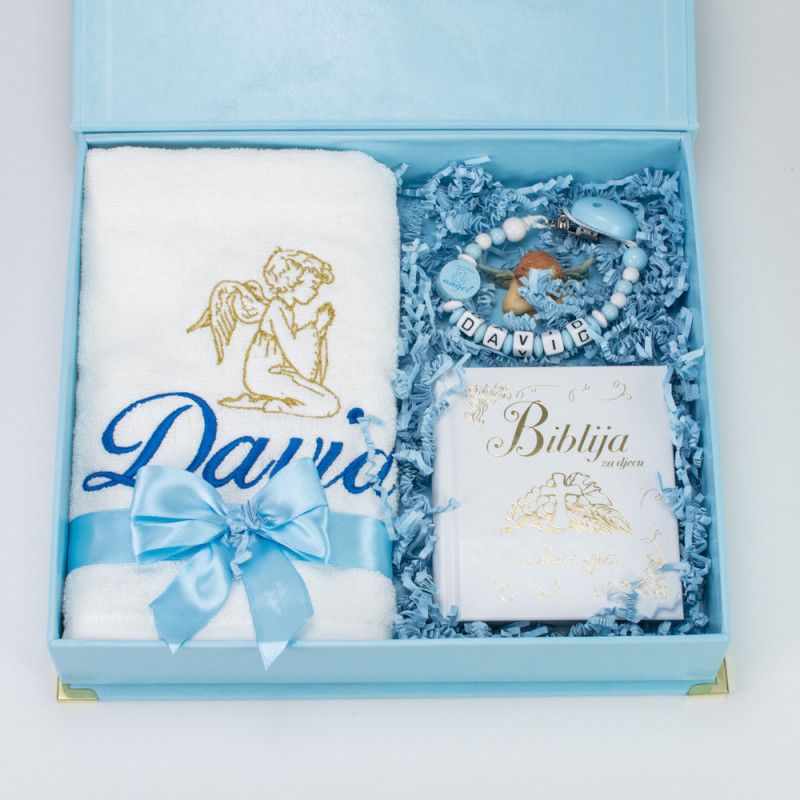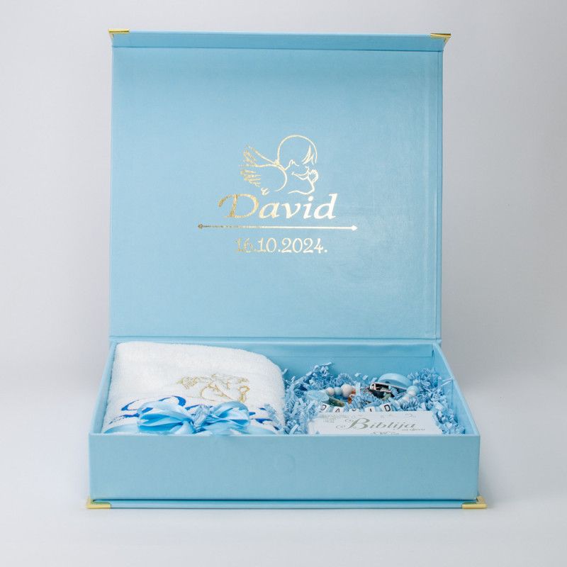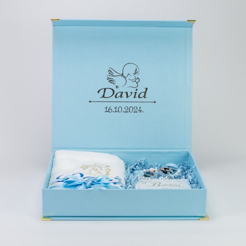 Baby Box za krštenje savršen je poklon za posebni dan. Paket sadrži personaliziranu poklon kutiju s magnetskim zatvaranjem, ručnik s vezom (40x80 cm), figuricu anđela, vezicu za dudu prilagođenu spolu i čestitku s prigodnom markicom. Po želji, dodajte knjigu s tematikom krštenja. Ovaj elegantni i promišljeni poklon set donosi radost i trajne uspomene na poseban događaj.
