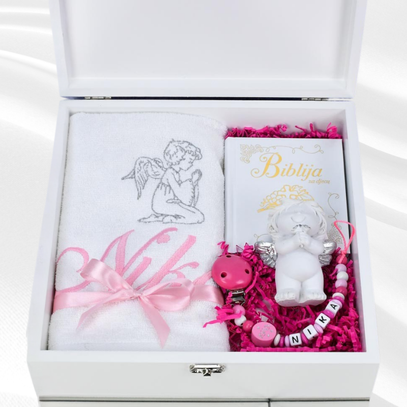 U prekrasnoj drvenoj kutiji nalaze se ručnik 40x80 s imenom i motivom, vezica za dudu s imenom, dječja Biblija i figurica anđela .