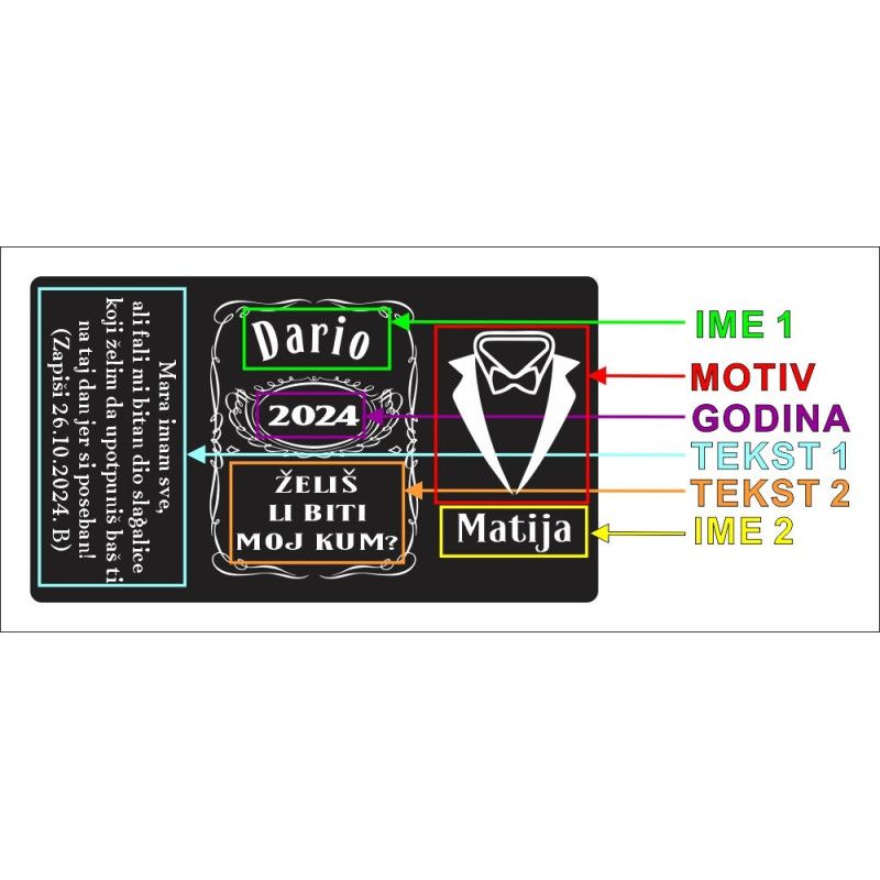 Gravirana čaša: Elegantna čaša s gravurom pruža sofisticiran dodir svakom piću. Gravura može sadržavati ime kuma, datum ili poseban tekst po vašem izboru, čineći ovu čašu trajnom uspomenom na poseban dan.