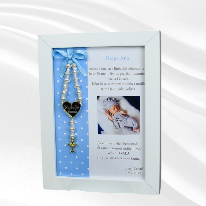 Okvir je dizajniran s pažnjom prema detaljima, kombinirajući eleganciju i duhovnu simboliku. Krunica, izrađena ručno s preciznošću i ljubavlju, predstavlja trajni simbol vjere i duhovne podrške koju kumovi pružaju vašem djetetu. Fotografija djeteta u središtu okvira dodatno personalizira poklon, čineći ga nezaboravnom uspomenom na poseban dan krštenja.