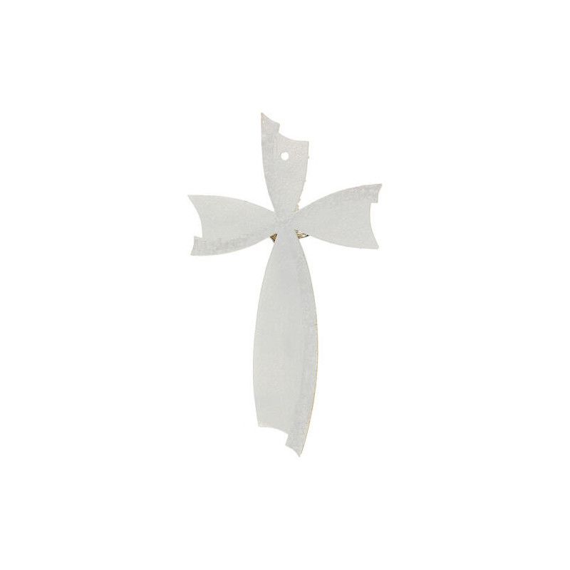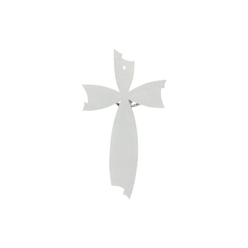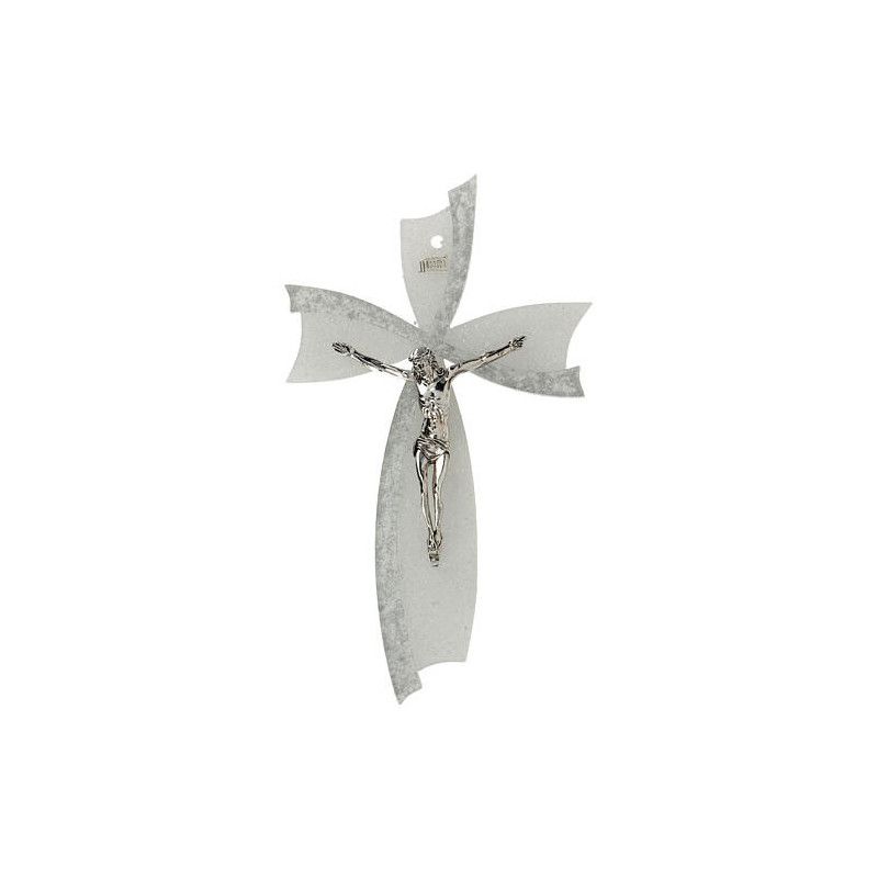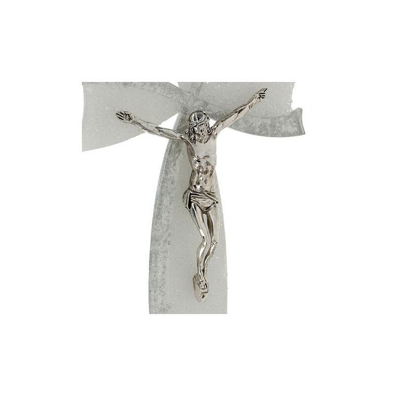Elegantni zidni križ od murano stakla u bijeloj/srebrnoj boji s glitter efektom. Dimenzije 15x10 cm, hrapava površina.