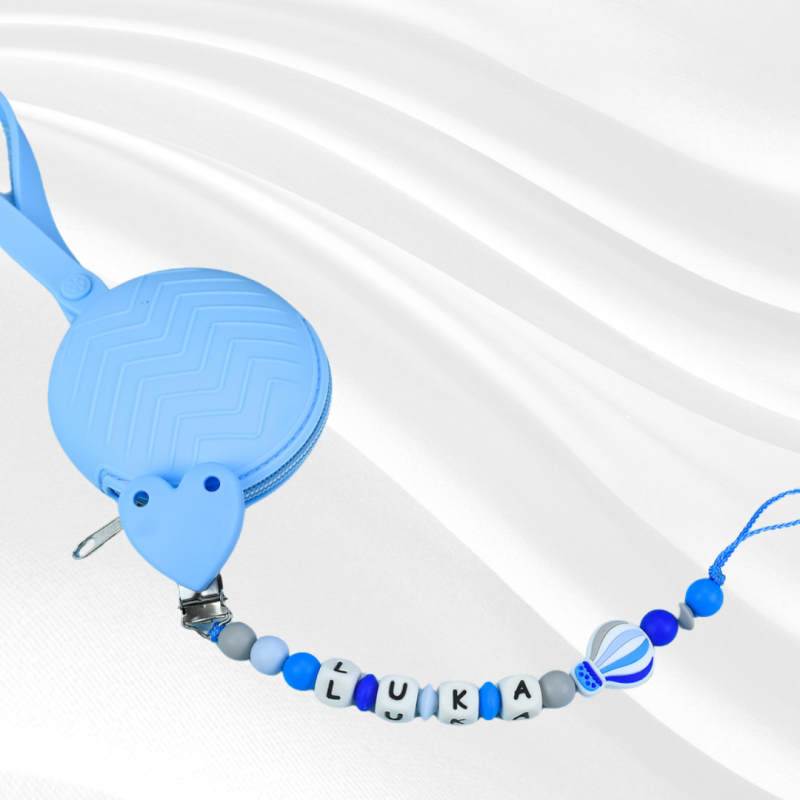 Estetski i moderno dizajnirana silikonska vezica za dudu Balon na Vrući Zrak je korisna i originalna poklon ideja za mame i bebe. Sprječava gubitak dude i pomaže bebi tijekom nicanja zubića. Ručno izrađena, personalizirana s imenom djeteta, dolazi u različitim oblicima i bojama, pomažući razvoju osjetilnih vještina. Sigurna je i u skladu s EU standardima.
