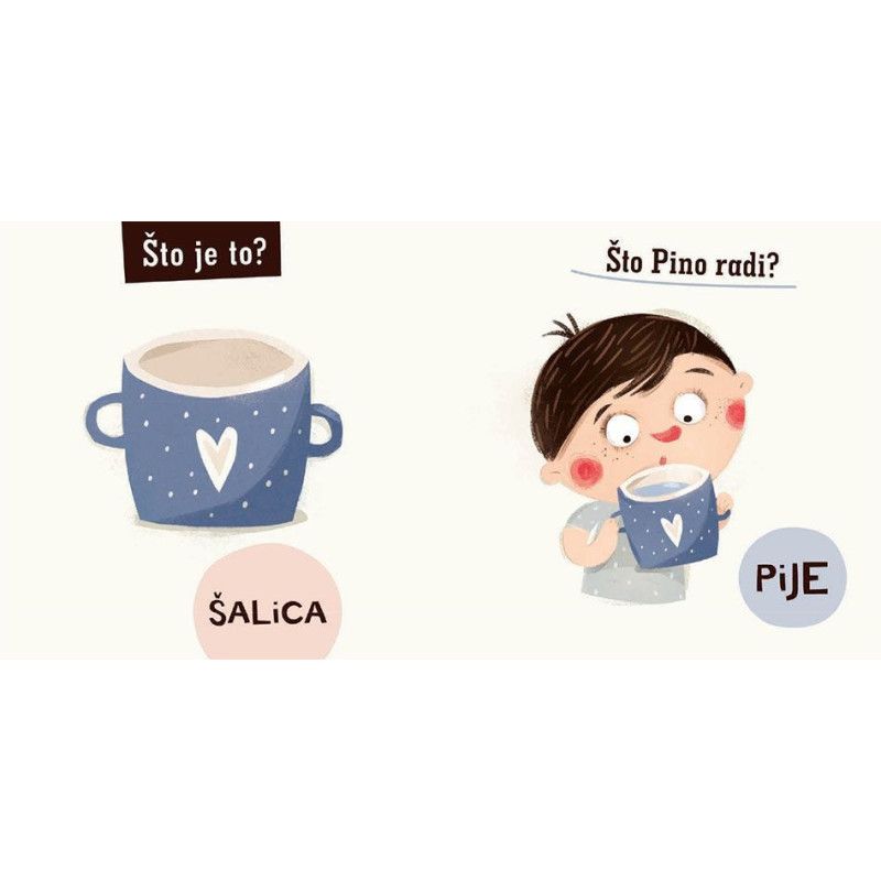 "Što radi Pino?" je simpatična kartonska slikovnica koja vodi najmlađe kroz svijet govora. Omiljeni junak Pino pokazuje osnovne aktivnosti kroz ilustracije, potičući učenje imenica i glagola na zabavan način.