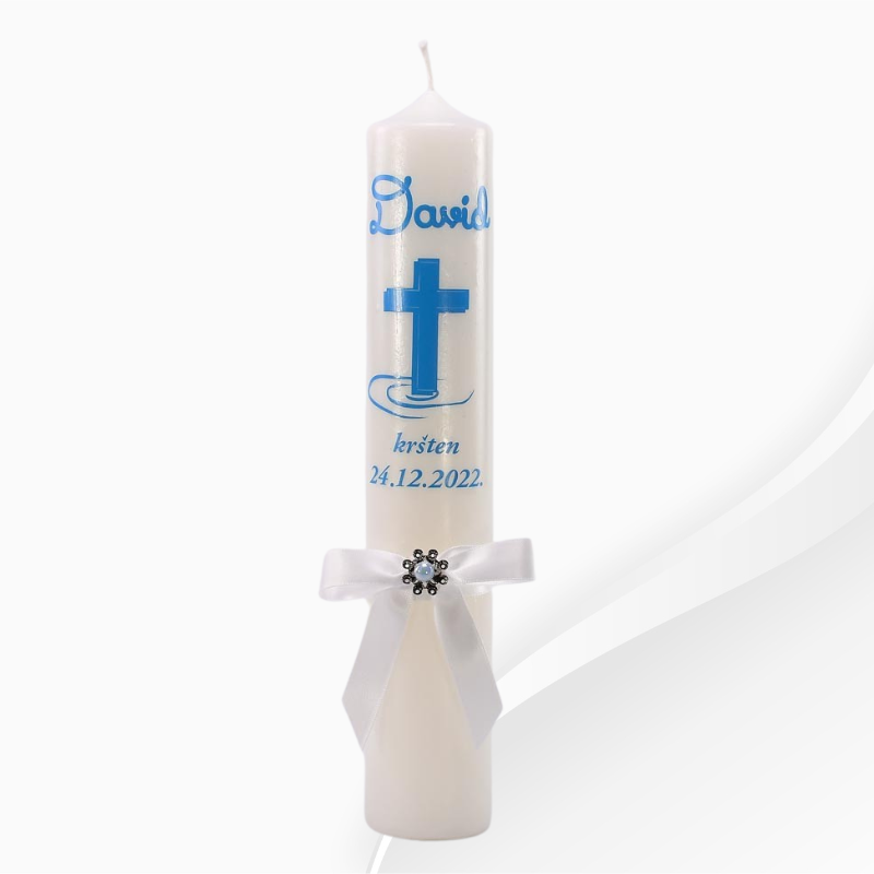 Dizajn i Motiv: Motiv križa i vode na svijeći nije odabran slučajno. Križ je jedan od najprepoznatljivijih simbola kršćanstva, predstavljajući vjeru, nadu i spasenje. Kroz povijest, križ je bio simbol Kristove žrtve i pobjede nad smrću. U kontekstu krštenja, križ označava duhovni put koji dijete započinje.