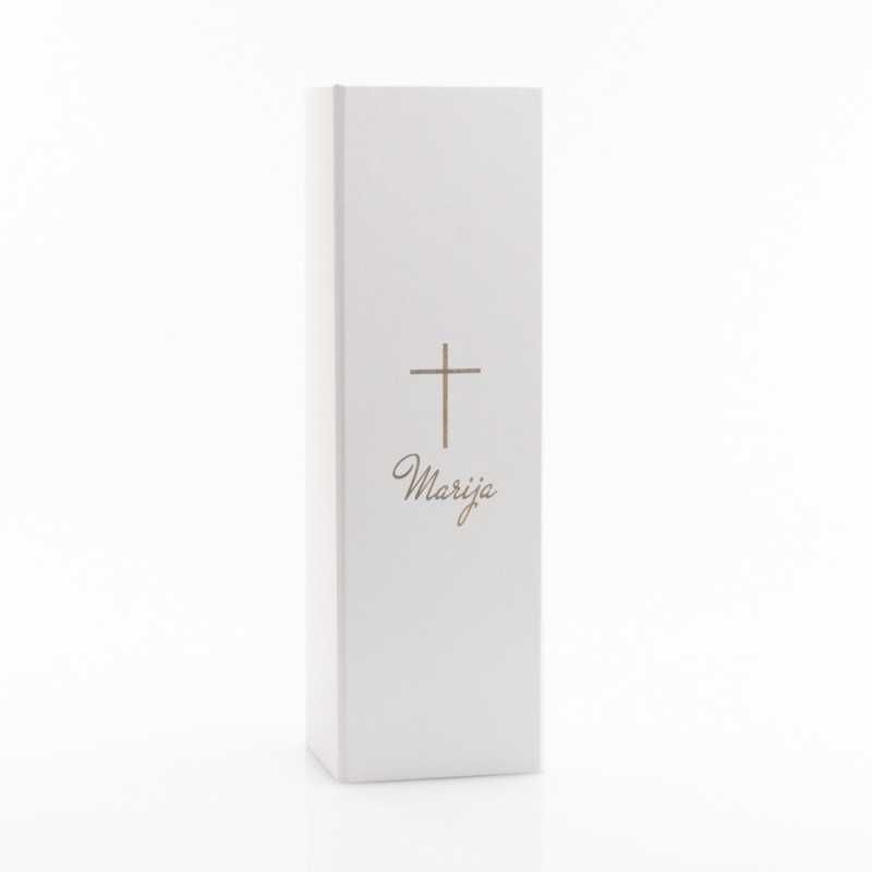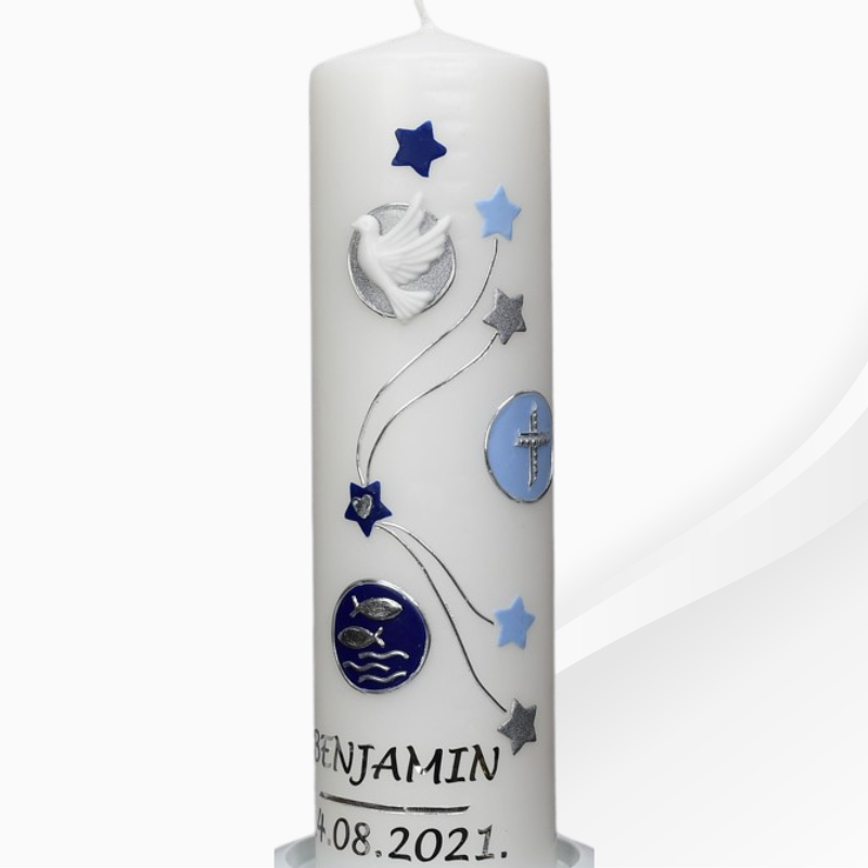 Dekoracija je izrađena od voska, a zbog ručne izrade moguća su odstupanja od fotografije. Ova svijeća simbolizira početak i kraj, vječnost i vjeru, te je idealna za svečani obred krštenja.