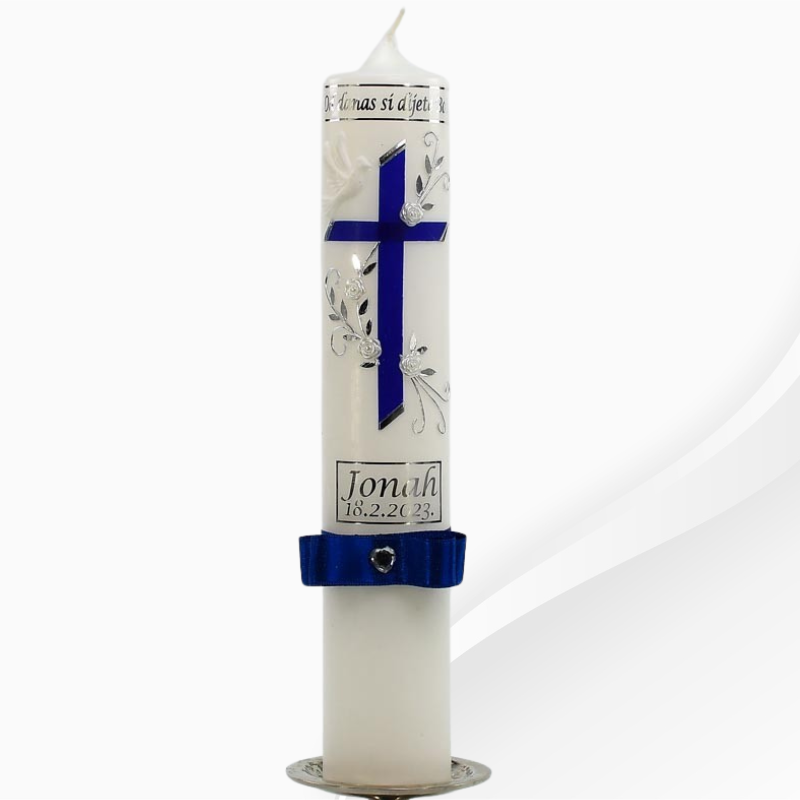 Značenje Motiva Križa: Križ, kao centralni motiv na svijeći, ima duboko ukorijenjenu simboliku u kršćanskoj vjeri. On predstavlja žrtvu Isusa Krista za spasenje svijeta i vječni život vjernika. Stavljanjem križa na krsnu svijeću, simbolički se poziva Božji blagoslov na dijete koje se krsti i označava početak njihovog duhovnog putovanja u kršćanstvu.