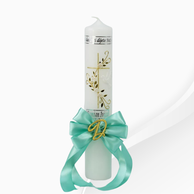 Pakirana u kutiju presvučenu perla bijelim materijalom. Ova svijeća donosi simboliku vjere i duhovnosti, idealna za krštenje ili posebne obrede.