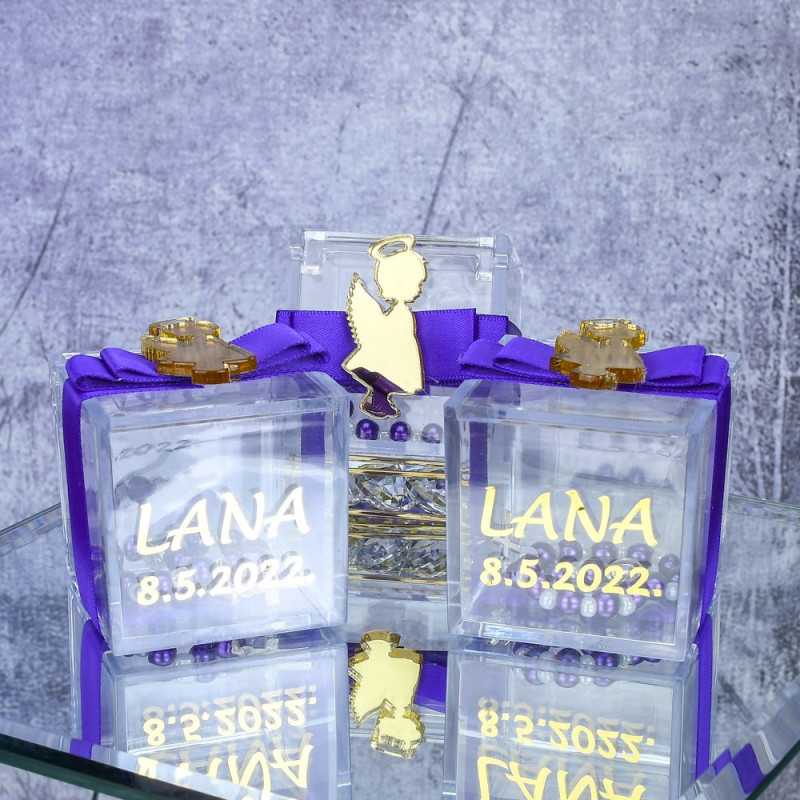 Unutrašnjost kutije krije malu krunicu, simbol vjere i zaštite, koja će svakom gostu poslužiti kao trajna uspomena na ovaj poseban dan. Dekorirana figuricom anđela, bonboniera nosi dodatnu simboliku mira i ljubavi. Naljepnica s imenom djeteta i datumom krštenja personalizira svaki dar, čineći ga posebnim i unikatnim.