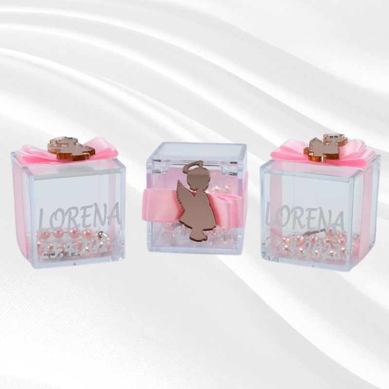 Elegantan poklon gostima na krštenju, ova bonboniera punjena perlama i cvjetićima dolazi u pleksi kutiji. Personalizirana je anđelom s imenom i ukrašena satenskim trakama, stvarajući nezaboravan suvenir za poseban dan.