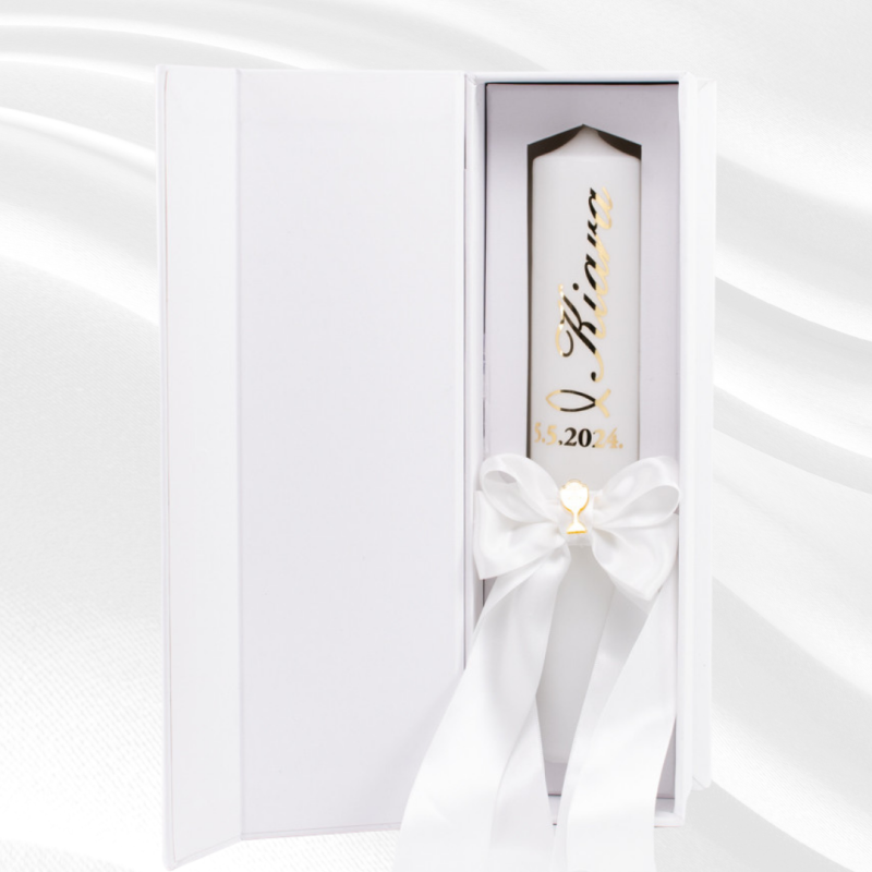 Svijeća za prvu pričest s dekoracijom zlatnog kaleža idealan je izbor za roditelje, kumove i prijatelje koji žele pokloniti nešto posebno za ovaj važan događaj. Elegantno pakirana, spremna je za darivanje ili osobnu upotrebu tijekom ceremonije.