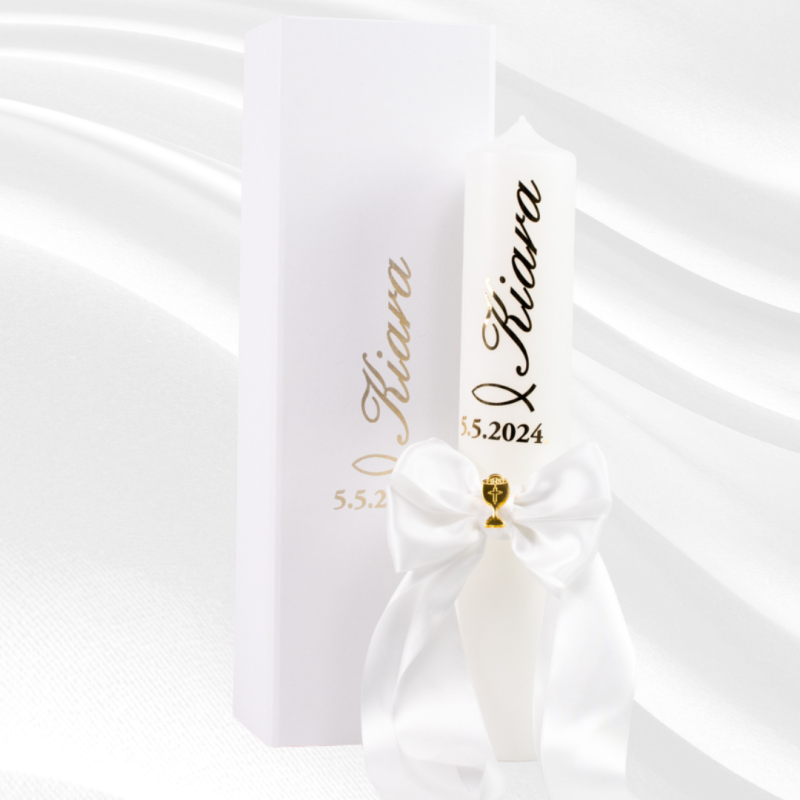 Naša svijeća za prvu pričest s dekoracijom zlatnog kaleža posebno je dizajnirana kako bi obogatila svečani trenutak prve pričesti. Svijeća je dekorirana elegantnom naljepnicom s motivom zlatnog kaleža, koji simbolizira čistoću, duhovnost i obnovu.