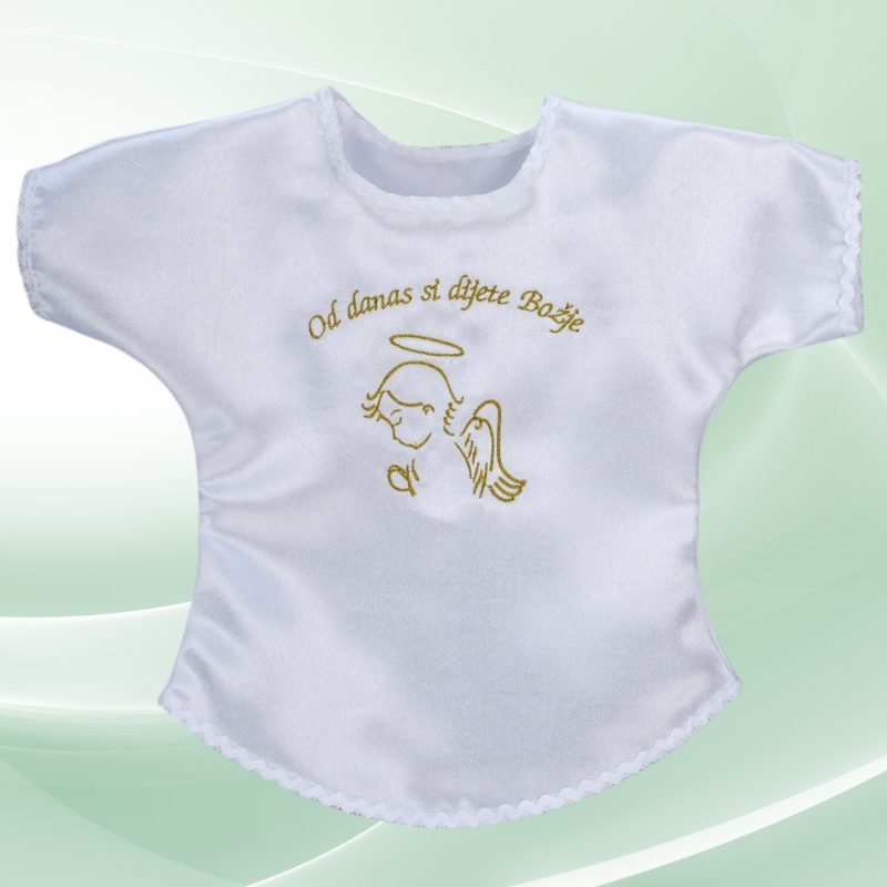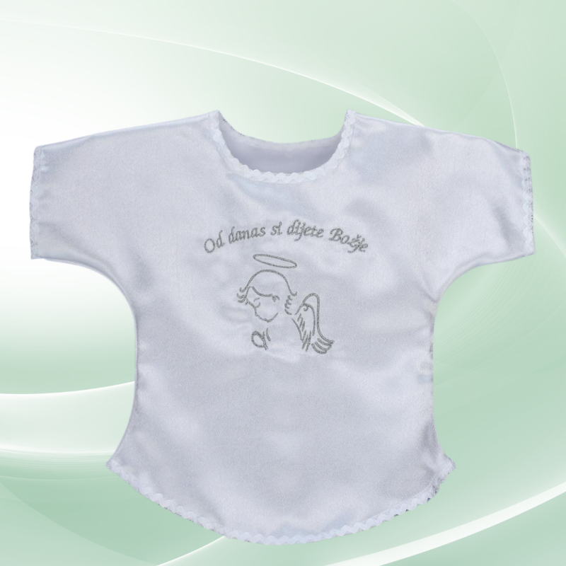 Krsna košuljica s motivom anđela vezanom rukom, univerzalna veličina (30 cm x 22 cm). Od satena, obrubljena pamučnom trakom, s mogućnošću personalizacije i brendiranja.