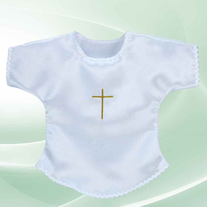 Krsna košuljica s elegantnim motivom križa izrađena je od kvalitetnog pamuka, obrubljena nježnom pamučnom trakom za dodatnu estetiku i trajnost. Motiv križa je vezen, čime košuljica odiše profinjenošću i simbolikom. Svojom univerzalnom veličinom (dužina 30 cm, širina 22 cm) idealno pristaje svakom djetetu, pružajući savršenu ravnotežu između praktičnosti i svečanosti.