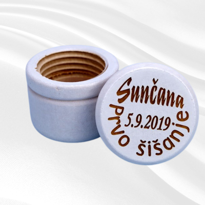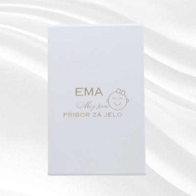 Personalizirana kutija za prve uspomene ručnog rada, presvučena knjigoveškim materijalom, dimenzija 30x26.5x10.5 cm. Sadrži album za fotografije, etui za prvi uvojak, četiri male kutije za sitnice i jednu veću za prve odjeće i obuću ili četiri manje i jednu veću vrećicu. Idealna za čuvanje dragocjenih trenutaka iz djetinjstva.