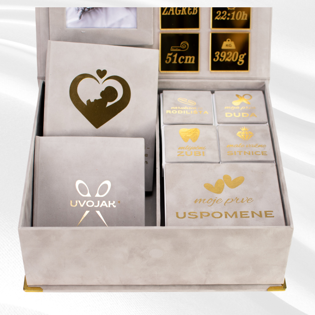 Kutija za uspomene nije obična kutija. To je pažljivo dizajniran prostor koji omogućuje roditeljima da čuvaju najvažnije trenutke iz ranog djetinjstva svog djeteta. Ručni rad, izrađena metodom kaširanja, i presvučena luksuznim plišom, ova kutija nije samo mjesto za pohranu, već i dragocjena uspomena sama po sebi.